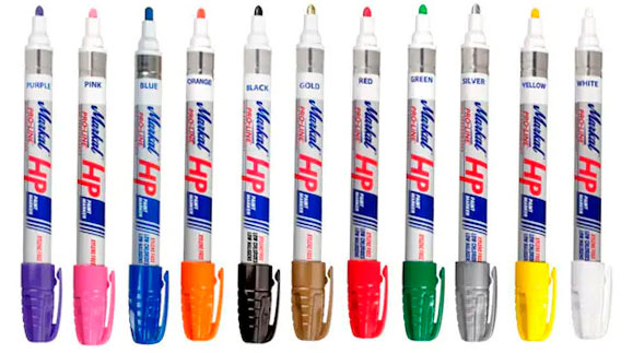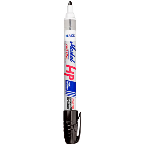 Markal Pro Line HP маркирует практически любые поверхности — металл, пластик, резину. Краска не содержит ксилена. Диапазон рабочих температур: от -46°C до +66°C. Прочный металлический корпус и износостойкий пулевидный наконечник обеспечивают продолжительный срок службы. Толщина наносимых линий — 3,0 мм.