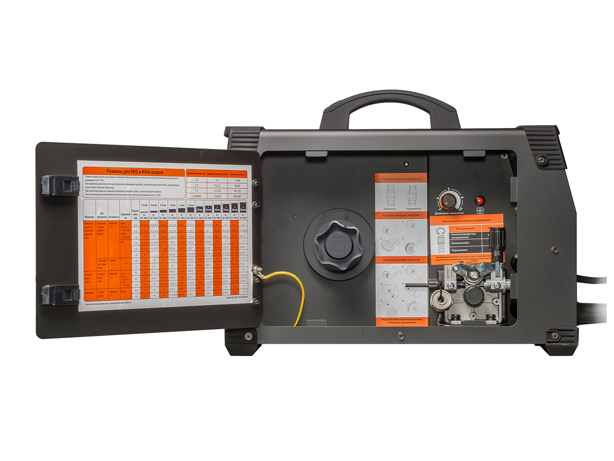 - На дверце бункера расположена таблица с настройками для MIG и MMA сварки. Также указана информация по установке катушки с проволокой и регулировки зажатия сварочной проволоки. Это особенно полезно для тех, кто только начинает осваивать сварку