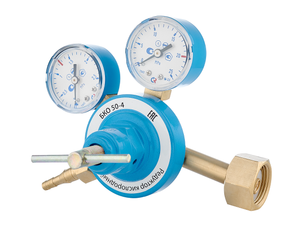 РЕДУКТОР КИСЛОРОДНЫЙ БКО 50—4 С ПОВЕРЕННЫМИ МАНОМЕТРАМИ предназначен для понижения давления поступающего из баллона газа и автоматического поддержания постоянным заданного рабочего давления при газопламенной обработке и смежных процессах.