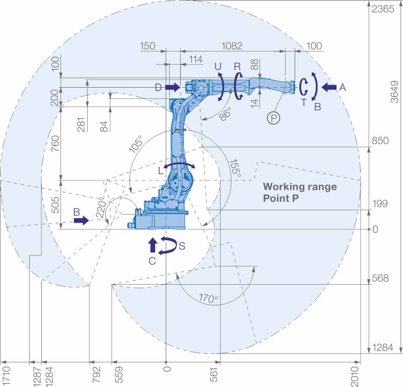 Благодаря длинному манипулятору, высокоскоростной робот Yaskawa MOTOMAN MA2010 с 6 осями, обеспечивает максимальный вылет в своем классе (макс. 2010 мм) и высокую грузоподъемность 10 кг.